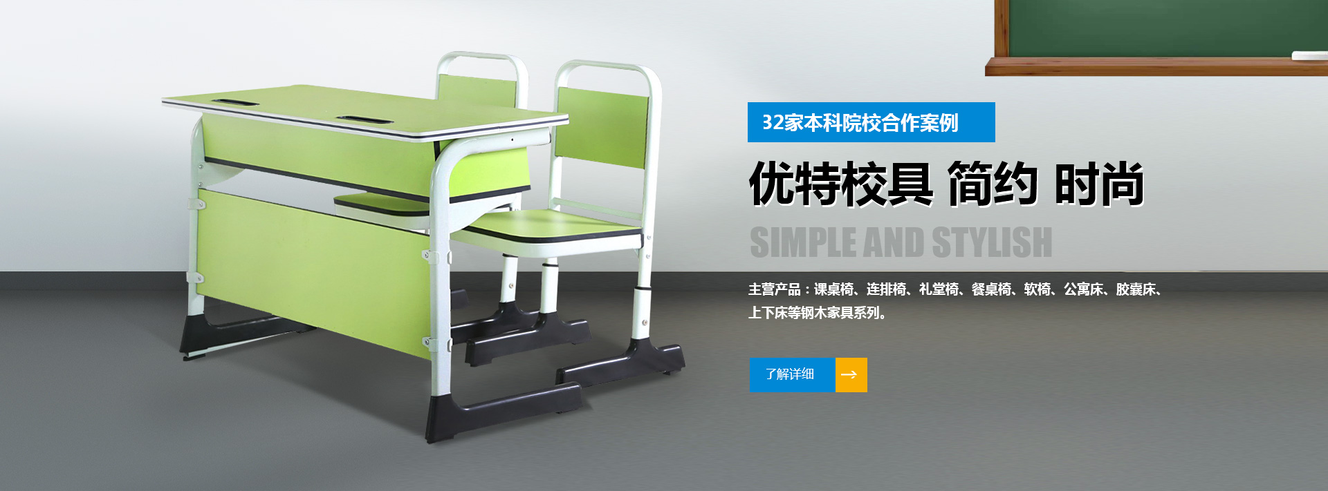 我公司位于河南省偃師市首陽(yáng)山鎮(zhèn)石橋村北環(huán)工業(yè)區(qū),是集研發(fā)、制造、銷售、服務(wù)為一體的綜合性學(xué)生課桌椅廠家,產(chǎn)品主要有課桌椅、連排椅、禮堂椅、餐桌椅、軟椅、公寓床、膠囊床、上下床等鋼木家具系列??筛鶕?jù)客戶需求提供定制化方案。